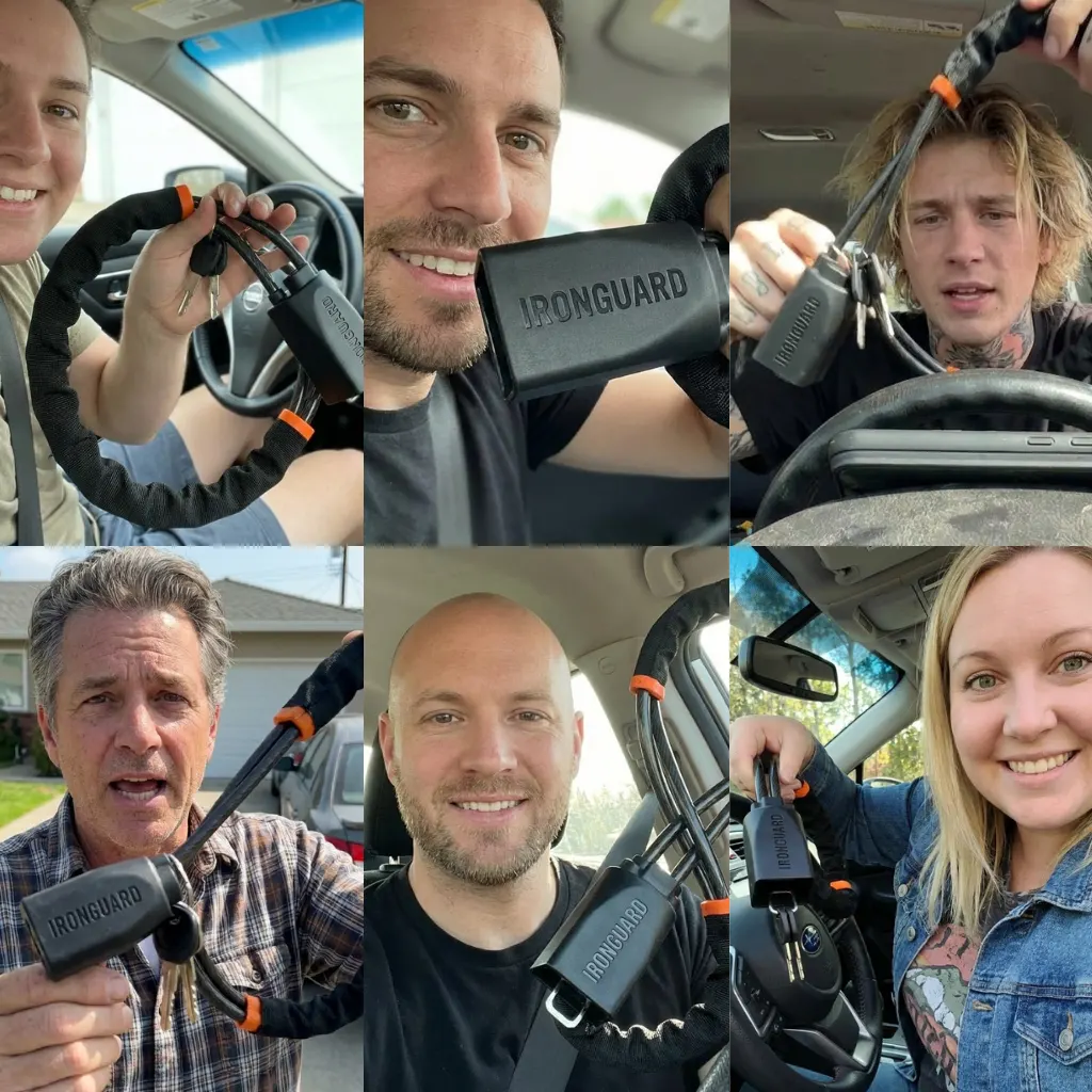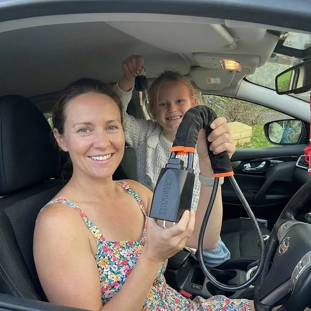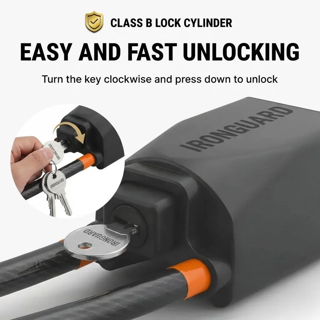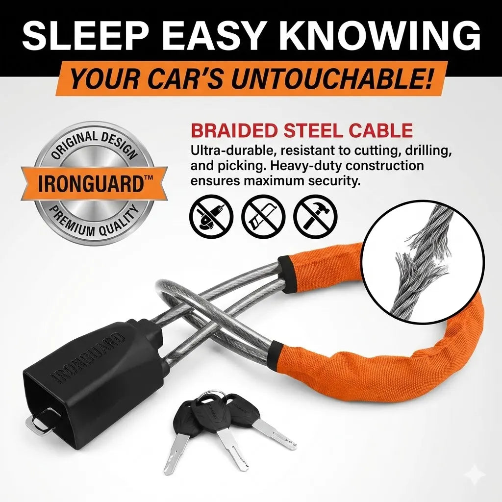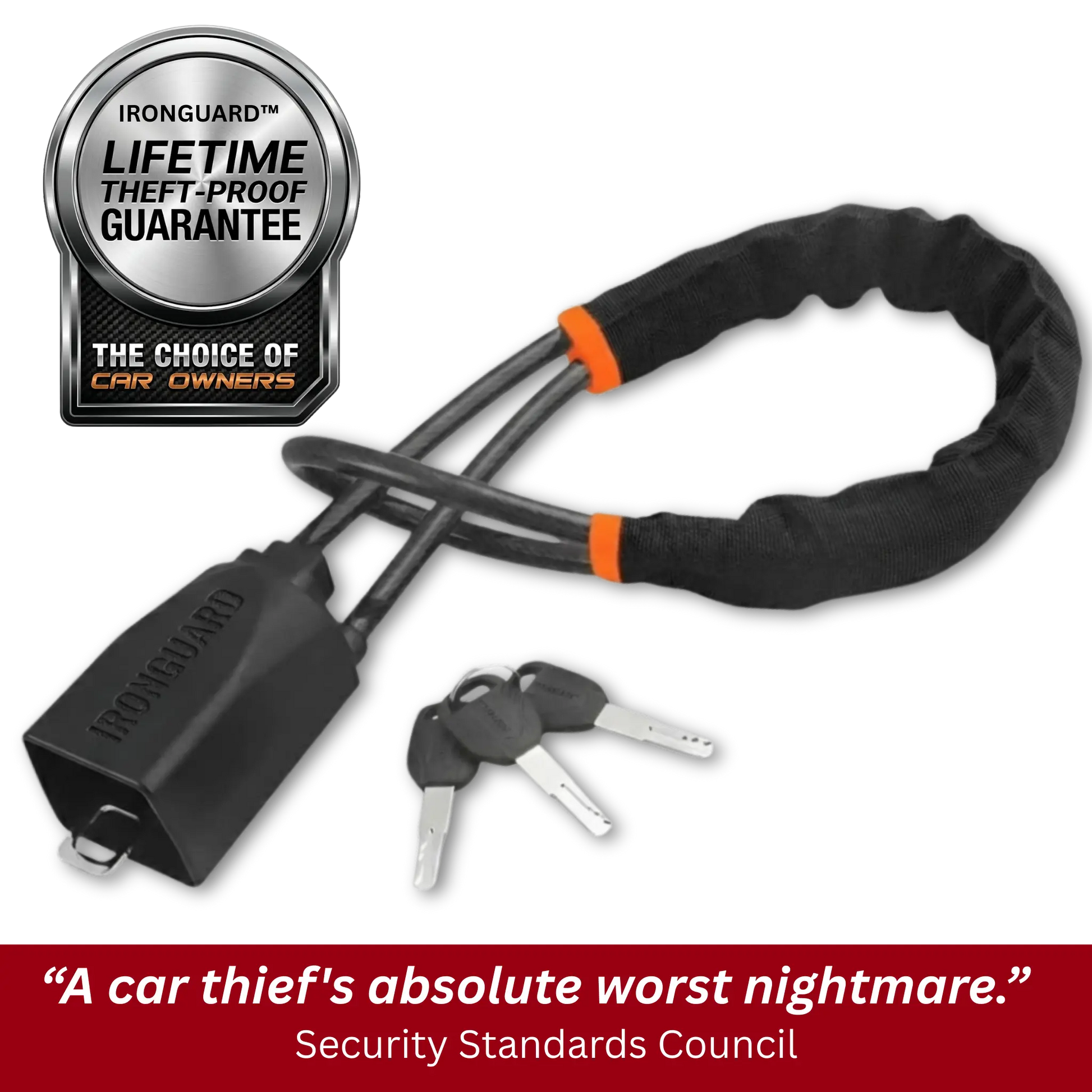 IronGuard's flexible cable design handles D-shaped wheels, flat-bottom sports wheels, thick luxury wheels, and unconventional seatbelt positions.