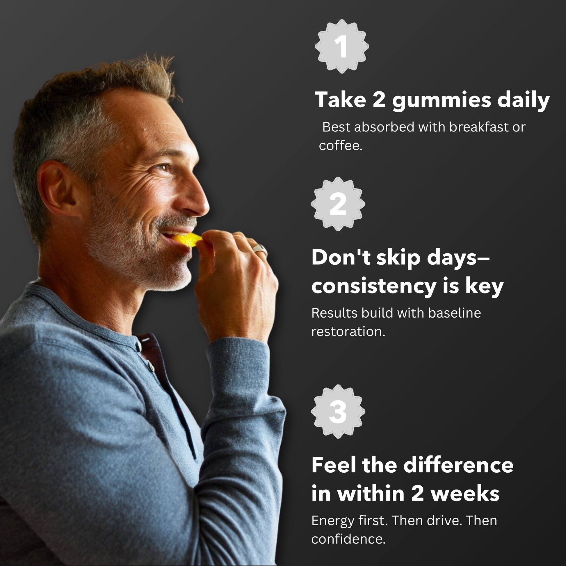 Step 1: Take 2 gummies daily with breakfast or your morning coffee